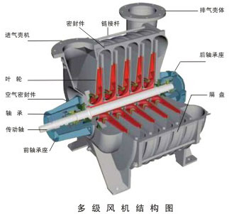 機殼材料采用HT250鑄件,經過時效和熱加工處理,保證強度及材料分子結構的穩定性。機殼的主要部件由進氣機殼、中間隔盤、排氣機殼組成,它們采用橡膠密封圈密封,并通過煤油滲漏試驗,保證氣體不泄露。葉輪出口處設有擴壓器,進口處設有回流器,保證鼓風機效率。為適應各種不同所需壓力和流量,鼓風機級數可采用2級-10級壓縮。進、出氣口位置根據用戶的需要,電機可以安裝在進氣端;也可以安裝在排氣端;法蘭面既可垂直向上,也可水平向左。